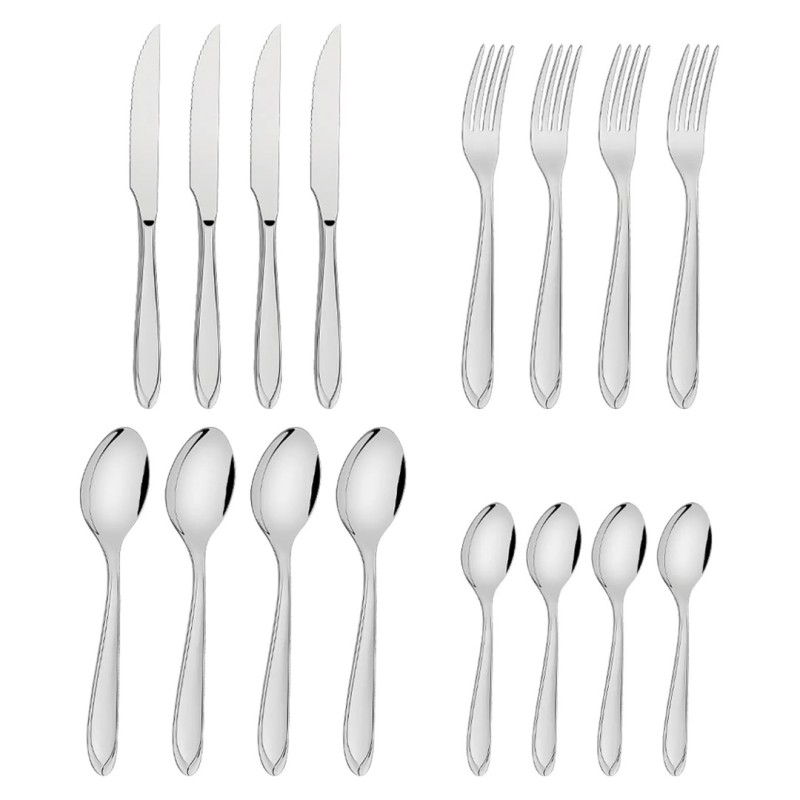 04 facas para churrasco, 04 colheres de mesa, 04 garfos de mesa, 04 colheres de chá a manual de instruções.